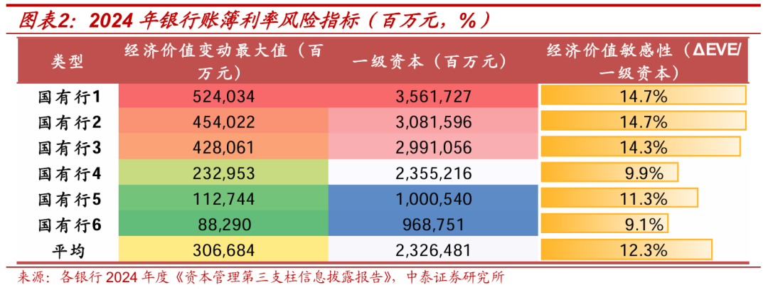 其次是常为被动承接机构的银行,也受利率指标限制,难以承接大量超长债。监管压力决定久期限制。银行近两年承接了较多超长期限的政府债发行,本身对资产负债的久期缺口具有放大效应,IRRBB监管标准框架下,目前银行账簿利率风险较大,截至2024年末国有行平均经济价值敏感度(ΔEVE/一级资本)为12.34%,其中有几家该指标已接近监管需予以关注的15%。在利率波动放大的情况下银行或在二级配债上仍以买入短债为主。