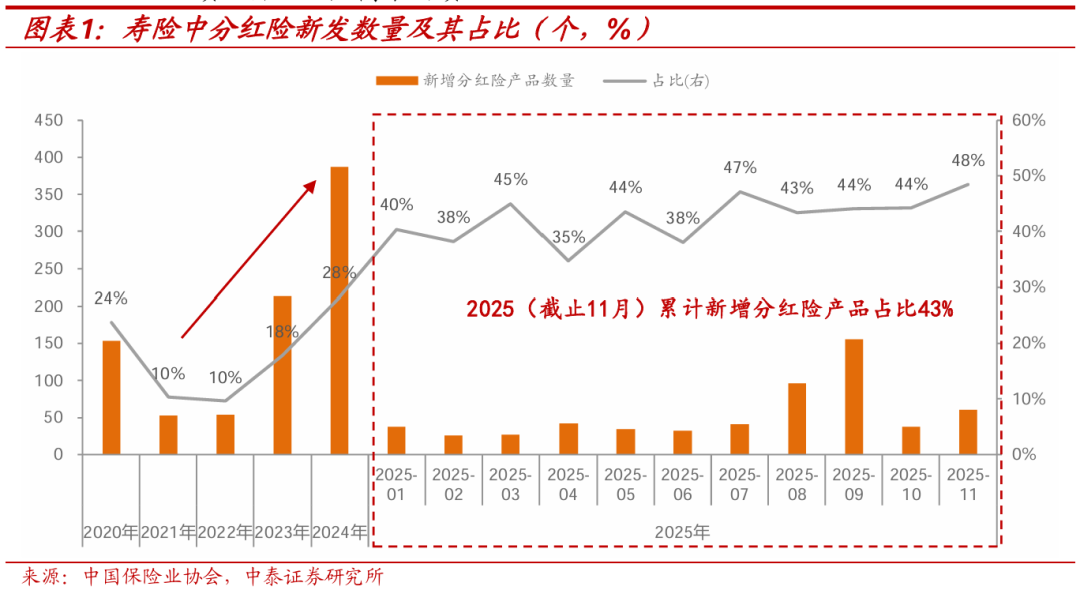 3)最后,今年以来保险主推的产品为分红险,而分红险相较传统险,具有更低的刚性负债成本和更短的有效久期。根据13精数据,截止2025年三季度末,今年分红险的保费突破7000亿,同比增长超10%,高于整体保费增速水平,观察新单保费增速或表现更高。